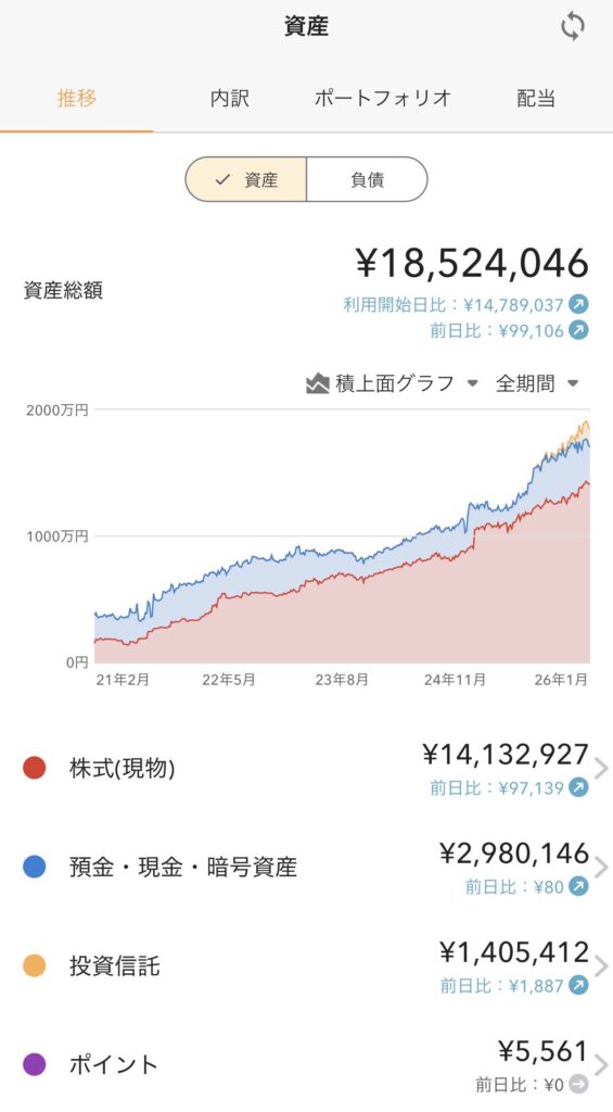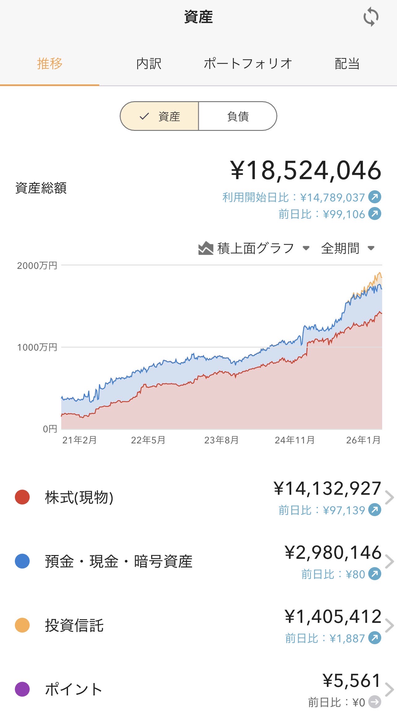 最後に恒例の現在の資金状況をメモ。マネーフォワードのアプリ画像をペタリ。