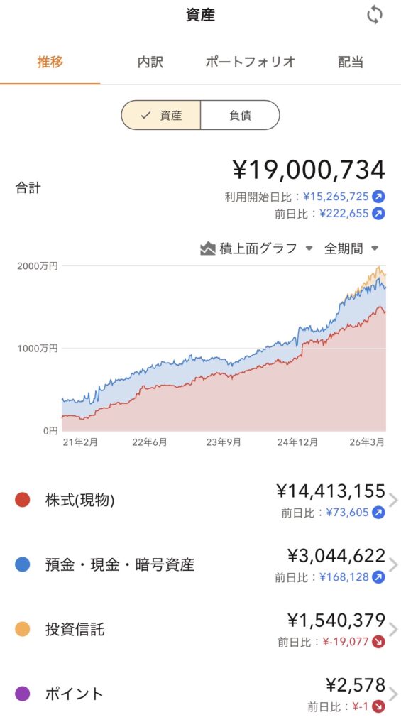 最後に恒例の現在の資金状況をメモ。マネーフォワードのアプリ画像をペタリ。