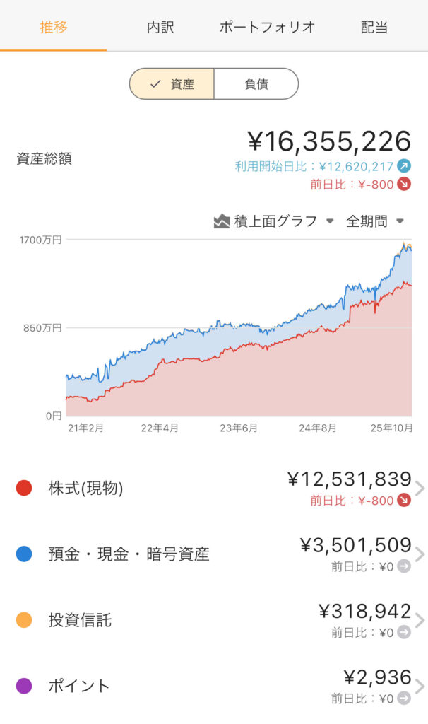 最後に恒例の現在の資金状況をメモ。マネーフォワードのアプリ画像をペタリ。
